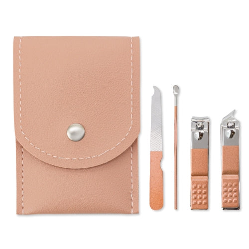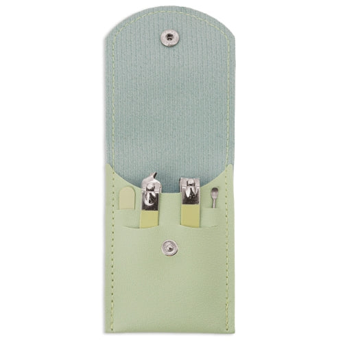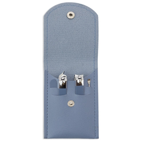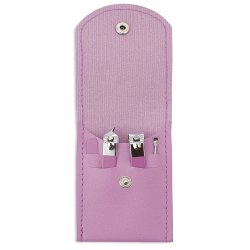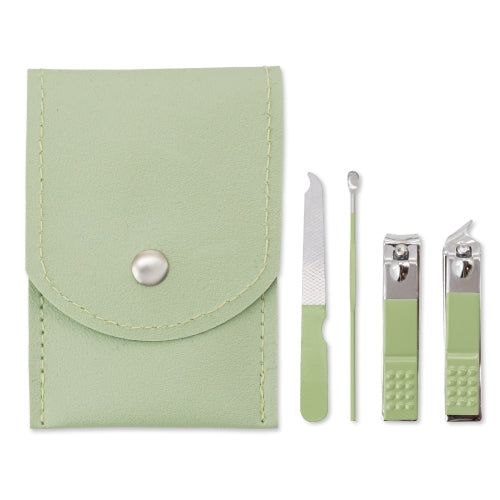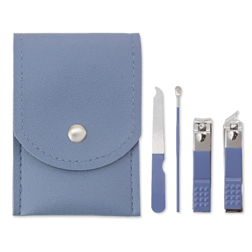 Set de manicura, disponible en cuatro colores, incluye dos cortaúñas, una lima y herramienta para las cutículas. Se sirve en un set de 12 unidades surtidas de color.
