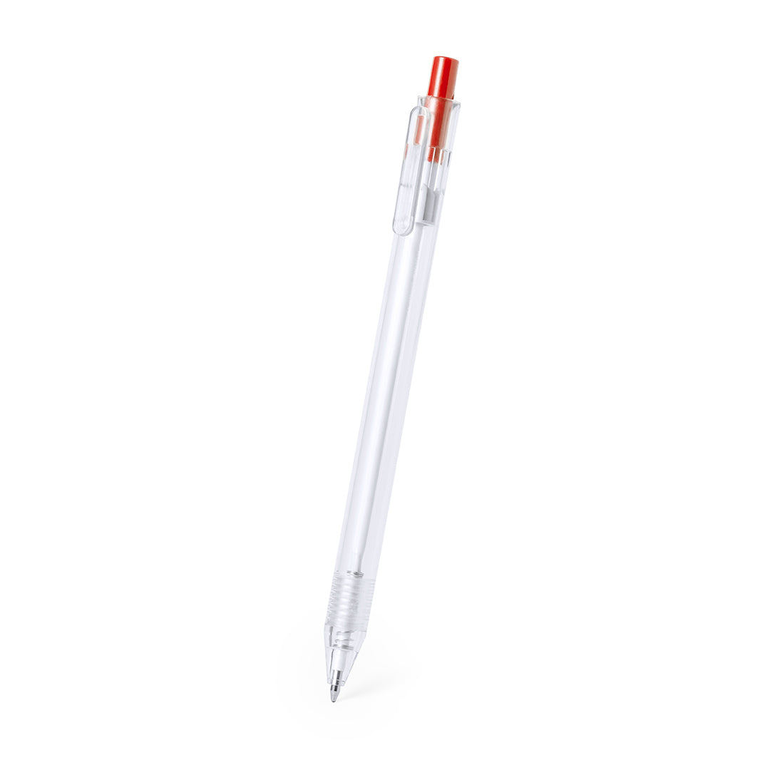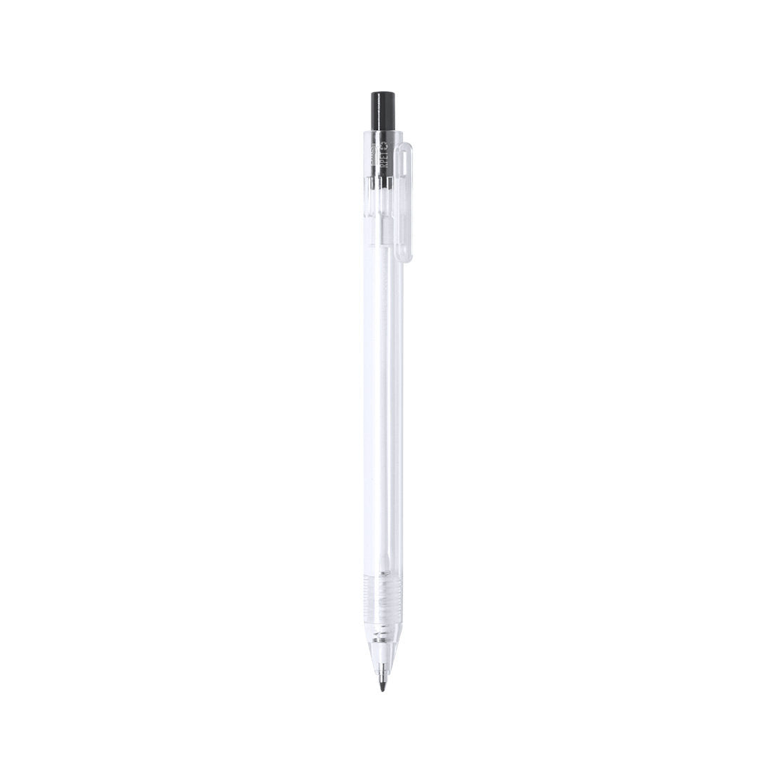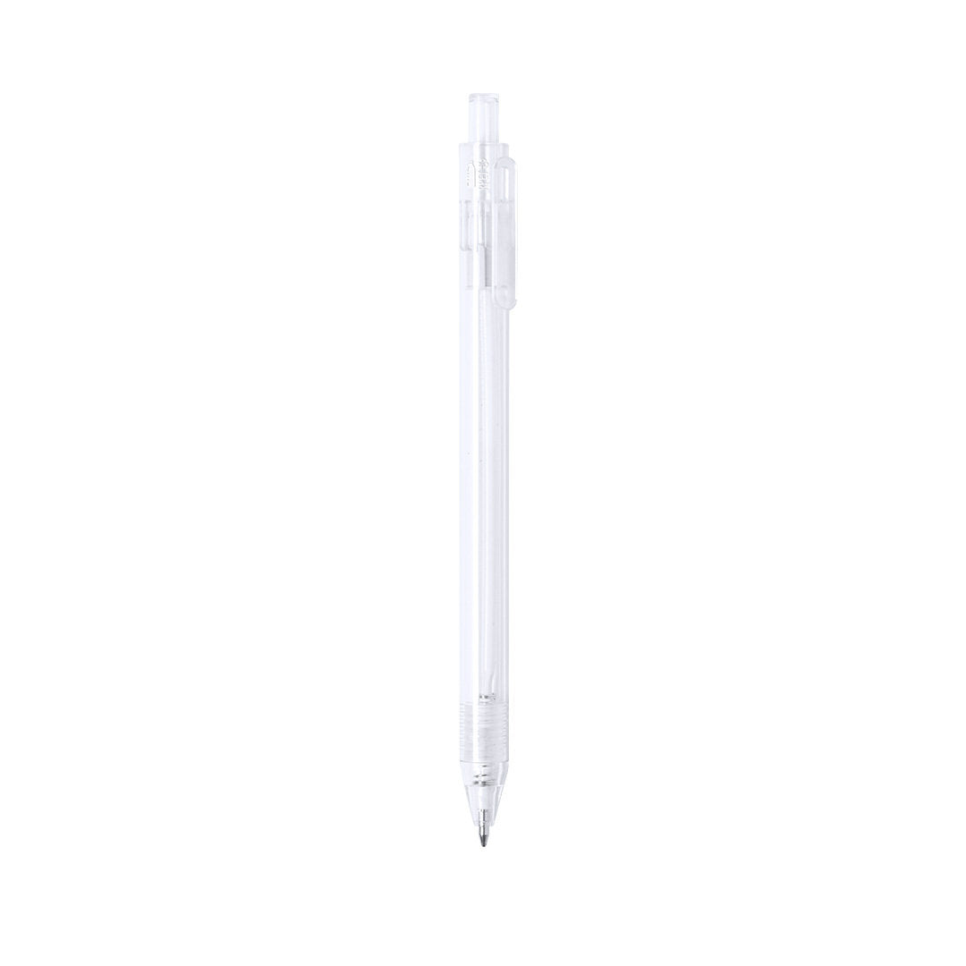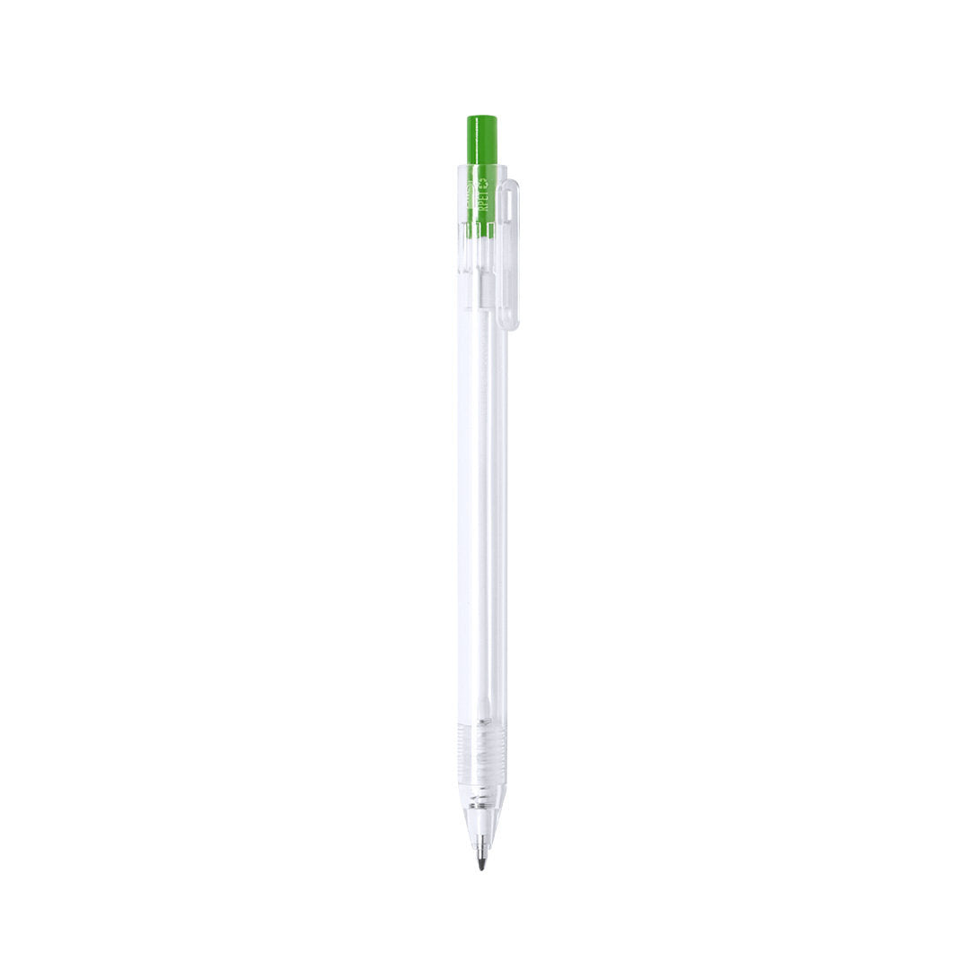 Bolígrafo de línea nature en material RPET, elaborado a partir de plástico reciclado para así fomentar la reutilización de residuos plásticos y ayudar a la sostenibilidad del planeta. De acabado translúcido y con pulsador disponible en variada gama de colores, con distintivo RPET en el cuerpo del bolígrafo. Especialmente diseñado para marcaje en tampografía, de mecanismo pulsador y con tinta azul.
