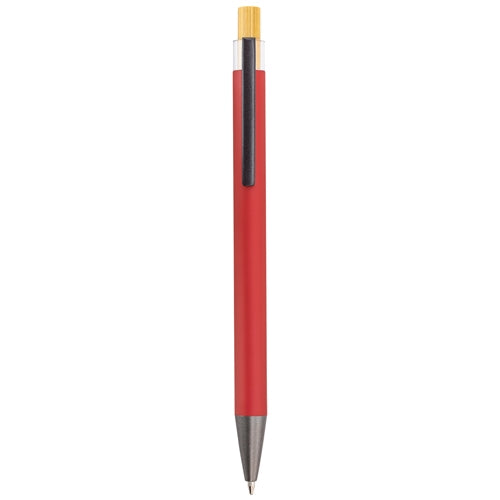 Bolígrafo con cuerpo de aluminio en acabado mate y pulsador de bambú natural. Combina estilo moderno y materiales eco, ideal para destacar con un detalle útil y sostenible.Escritura azul