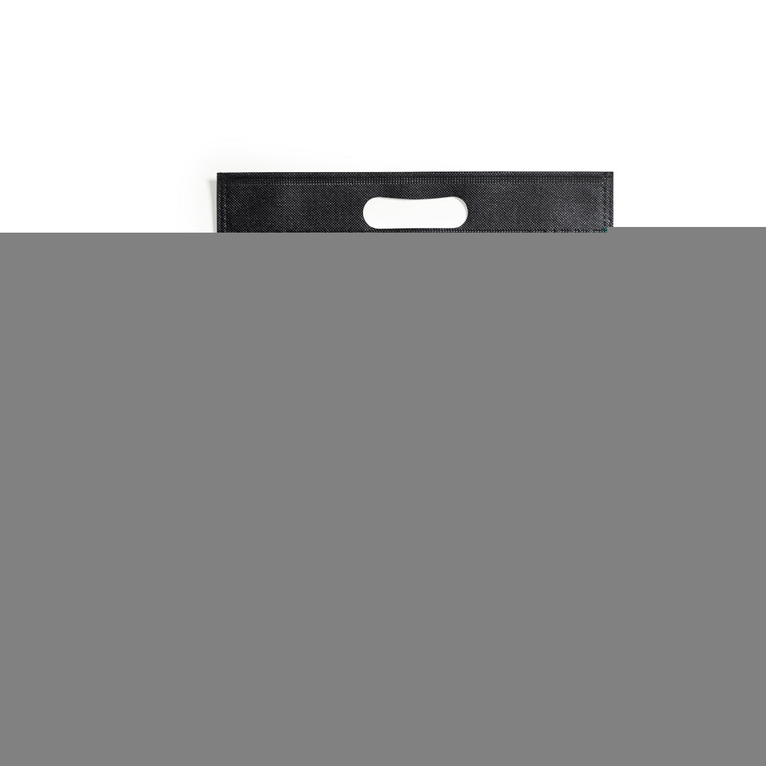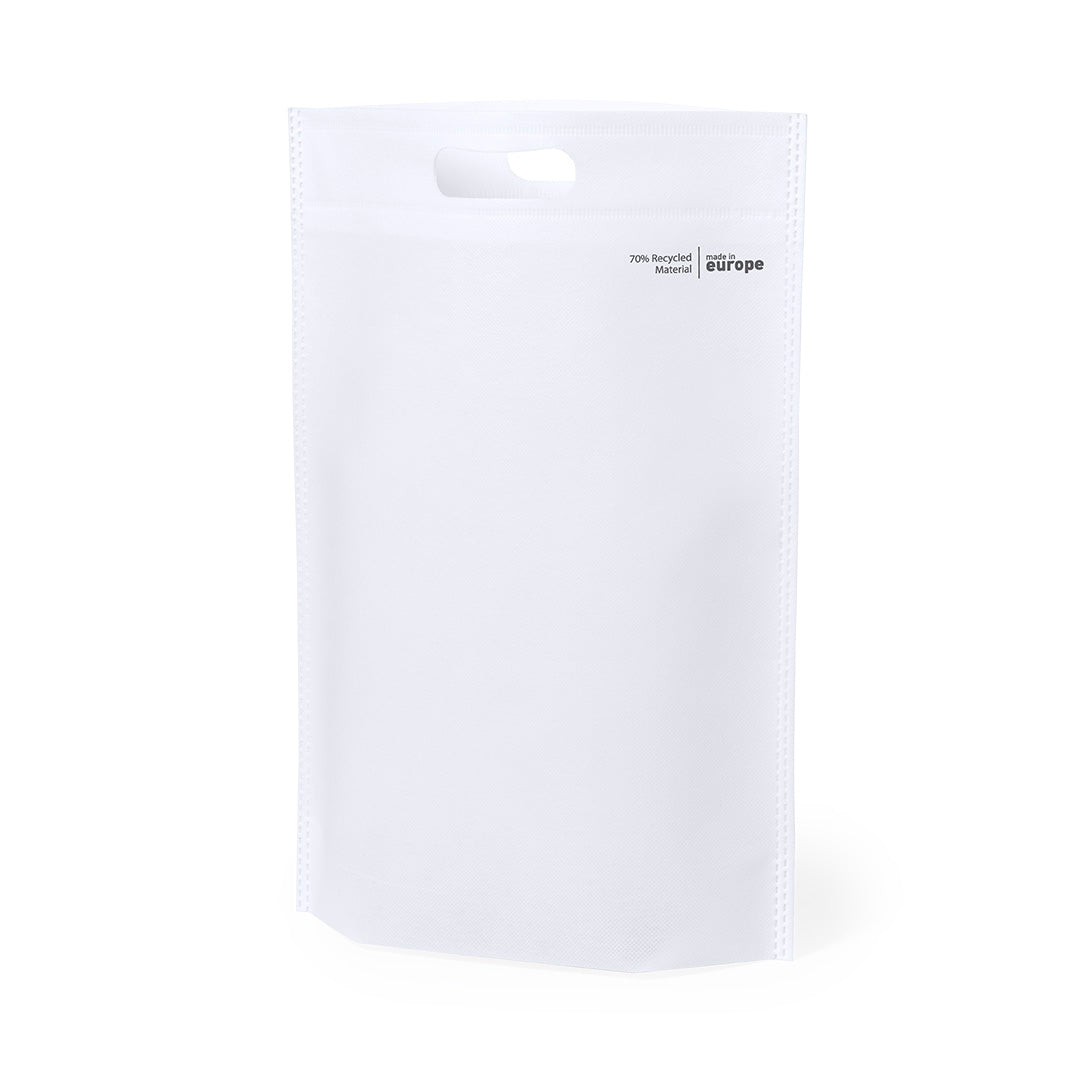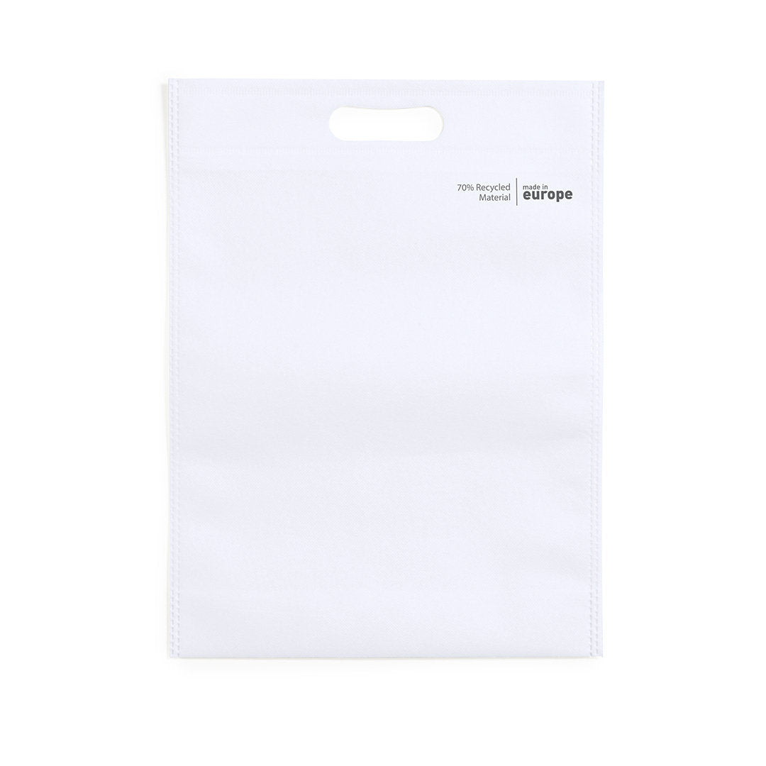 Bolsa de línea nature, fabricada en non-woven reciclado de 70g/m2. De fabricación europea, con acabado termosellado, fuelle en la base, asa reforzada troquelada y distintivo eco/made in sobre la bolsa.