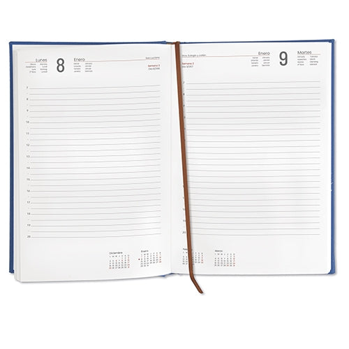 El Dietario Dublín Marino es el compañero perfecto para organizar tu día a día con un toque de distinción y elegancia. Este no es un simple dietario; su diseño con tapas de microfibras ofrece un tacto suave y agradable que invita a ser llevado contigo a todas partes. La calidad de su fabricación se ve reflejada tanto en el exterior como en cada una de las 352 páginas que lo componen. En su interior, encontrarás una agenda día por página en color blanco puro, facilitando la escritura y lectura de tus notas y compromisos. Pero va más allá de una simple agenda; incluye festivos nacionales e internacionales, direcciones y teléfonos de interés, el santoral, un listín telefónico y hasta un mapa político de Europa a todo color, herramientas imprescindibles para tu organización personal y profesional. Una característica distintiva del Dietario Dublín Marino es su universalidad, ya que viene con los meses y días en español, portugués, francés, inglés, alemán, italiano, euskera, catalán y gallego. Esto lo convierte en un compañero ideal no solo para uso personal sino también para entornos profesionales multilingües. No dejes pasar la oportunidad de llevar tu planificación al siguiente nivel con este elegante y funcional dietario.Dietario con tapas de micro-fibras de tacto muy agradable.El interior se compone de una agenda dia página en color blanco. Incluye festivos nacionales e internacionales, direcciones y telefonos de interés, santoral, listin telefonico y mapa político de europa a todo color.Meses y días en Español, Portugués, Francés, Inglés, Alemán, Italiano, Euskera, Catalán y Gallego.Incluye 352 hojas