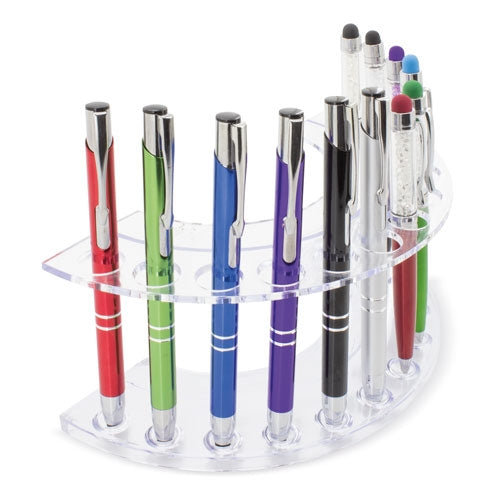 - Estructura transparente que resalta la belleza de los bolígrafos