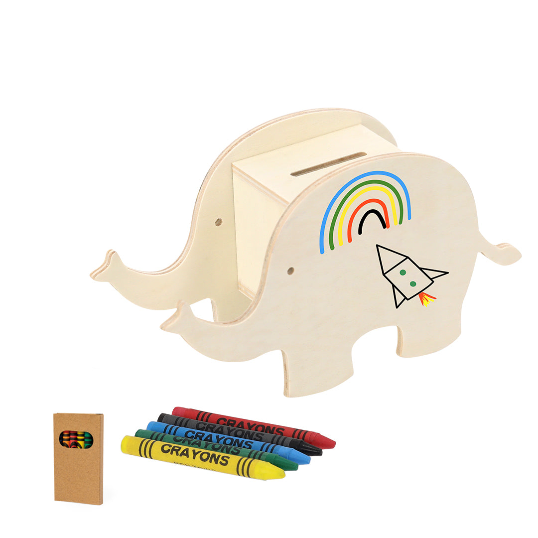 Hucha fabricada en madera natural con diseño de animales. Incluye ceras de colores que permite personalizar el diseño de cada hucha. Incorpora práctico agujero inferior para acceder fácilmente a los ahorros sin necesidad de romperla.. 5 Ceras Incluidas