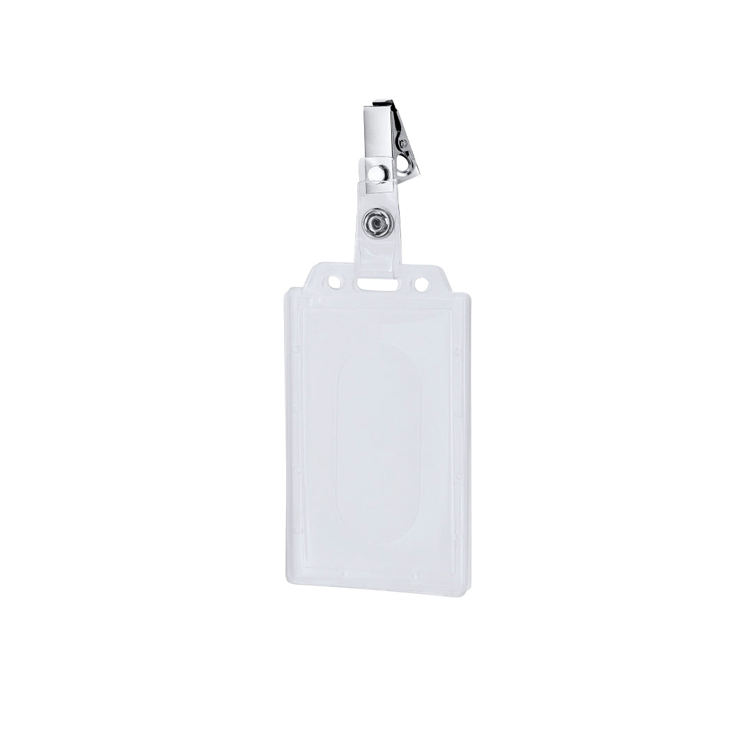 Identificador de PS rígido con pinza metálica en orientación vertical. Ideal para llevar colgado y mostrar tu identificación. El sistema de cierre es extraíble y puedes utilizar el identificador en conjunto con lanyard.