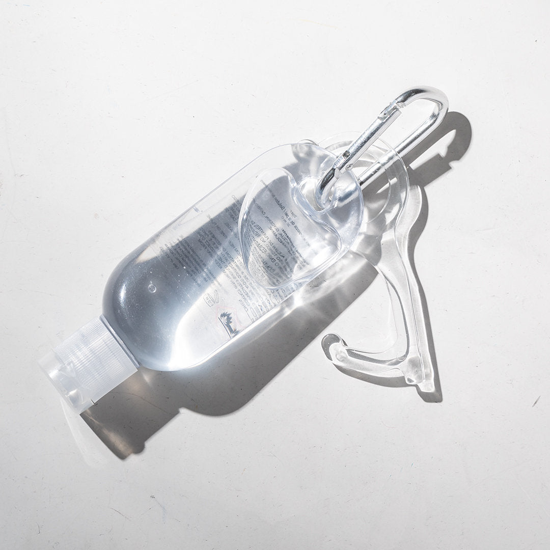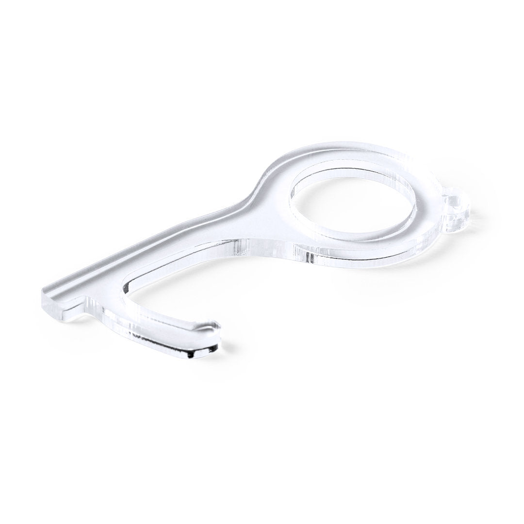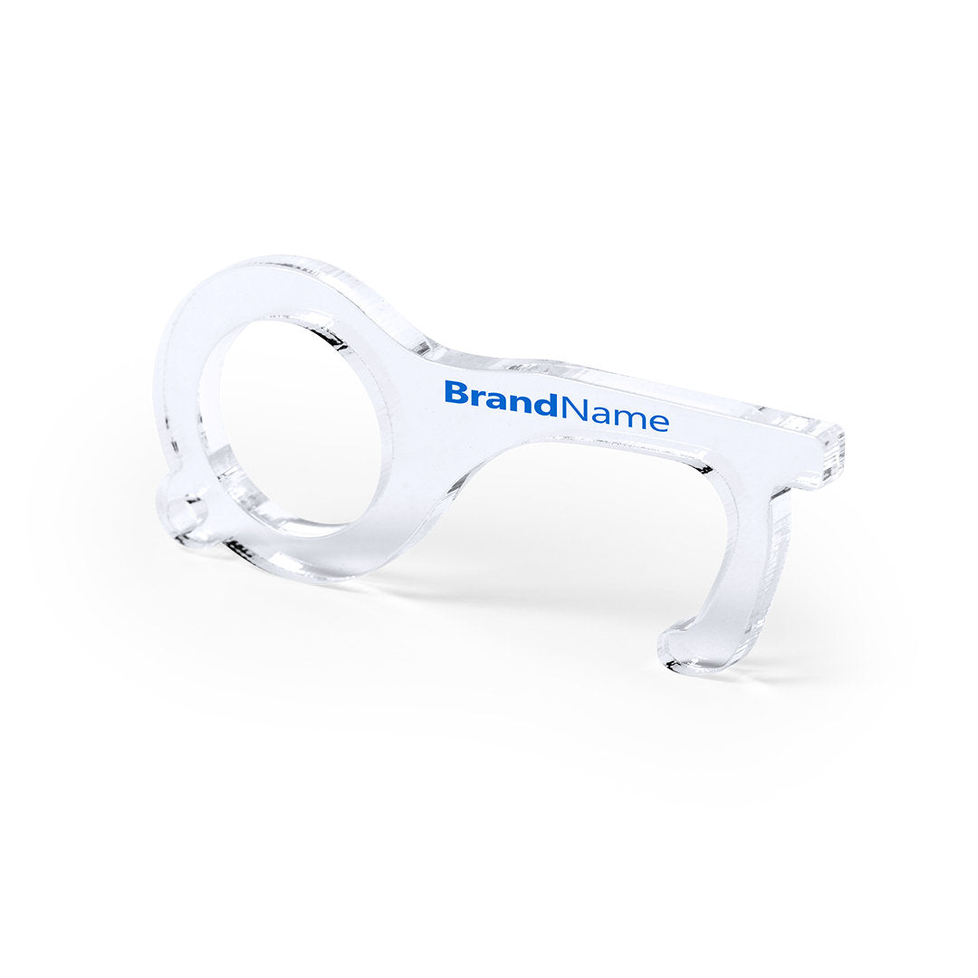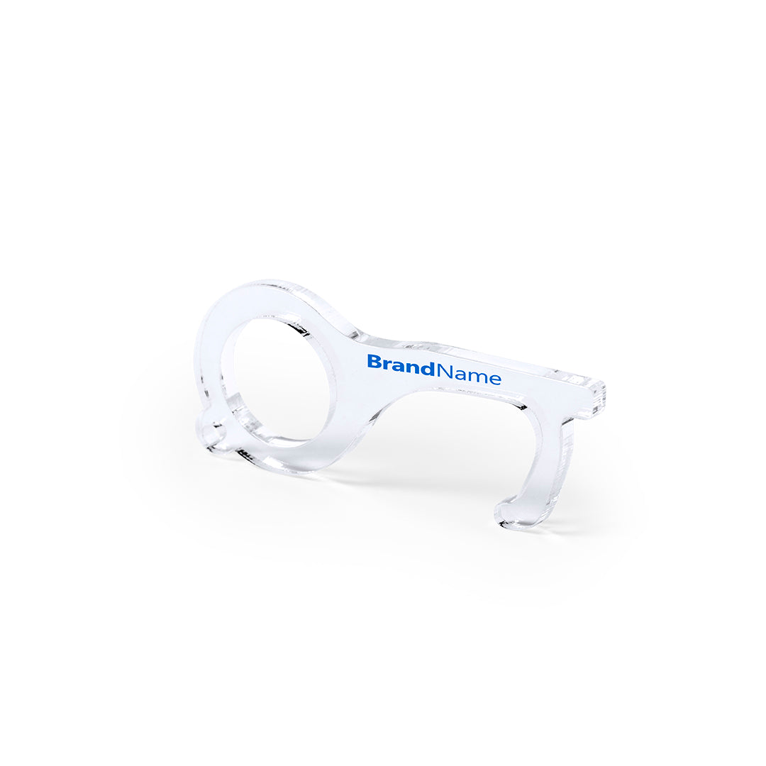 Llavero higiénico anti-contacto, fabricado en original y resistente material acrílico de acabado transparente. Especialmente diseñado para evitar tocar con las manos superficies de uso común (picaportes de puertas, interruptores, grifos de uso público, cajeros automáticos...). Con cómodo troquel para el dedo y presentado en bolsa individual de diseño. Recomendado para marcaje en tampografía.