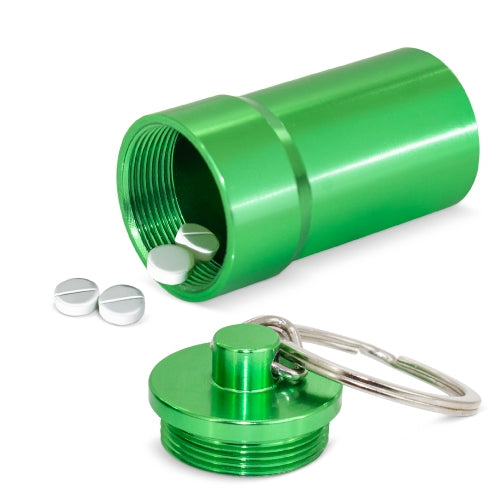 Cómo llavero para guardar artículos pequeños, disponible en plata, azul y verde.