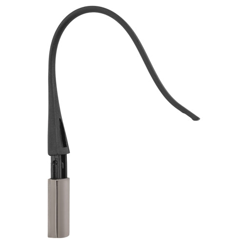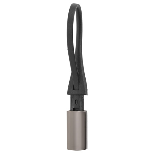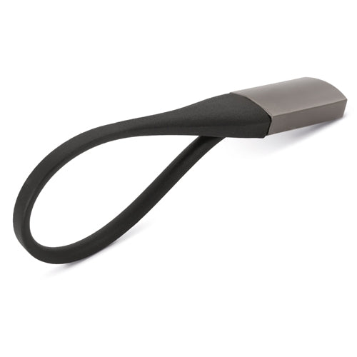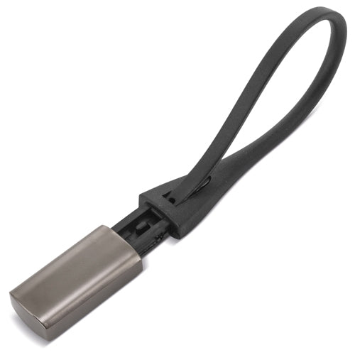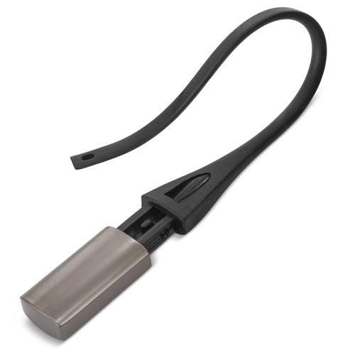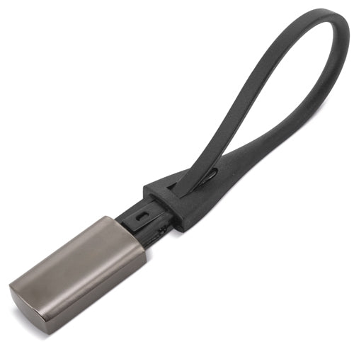 Llavero con cuerpo metálico combinado con una resistente cinta de silicona negra en forma de bucle.
