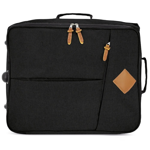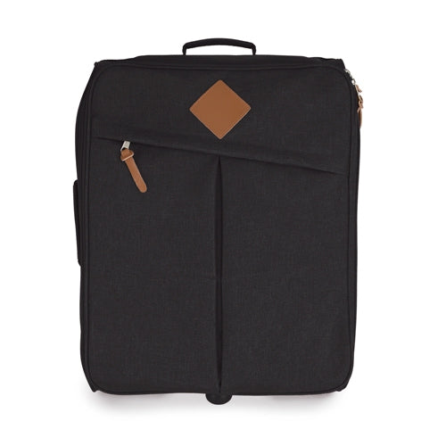 Moderno trolley de la firma Pierre Delone, con tejido jaspeado y apliques de polipiel color camel. Tiene dos ruedas y varios topes protectores en sus bases de apoyo. Gran capacidad y ligereza.