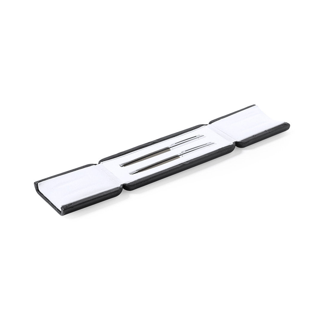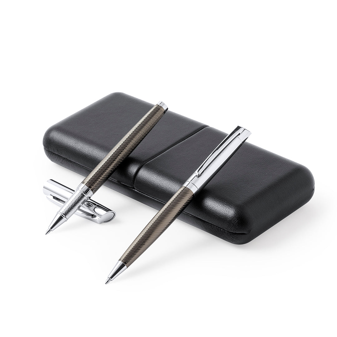 Set premium de bolígrafo y roller. Fabricado en elegante combinación de metal en tonos negros y cromados. Bolígrafo de mecanismo giratorio en tinta azul y con cartucho jumbo. Roller con capucha y tinta gel en azul, carga jumbo. Presentado en estuche individual de polipiel con interior en contraste de antelina en blanco.. Bolígrafo y Roller. Carga Jumbo
