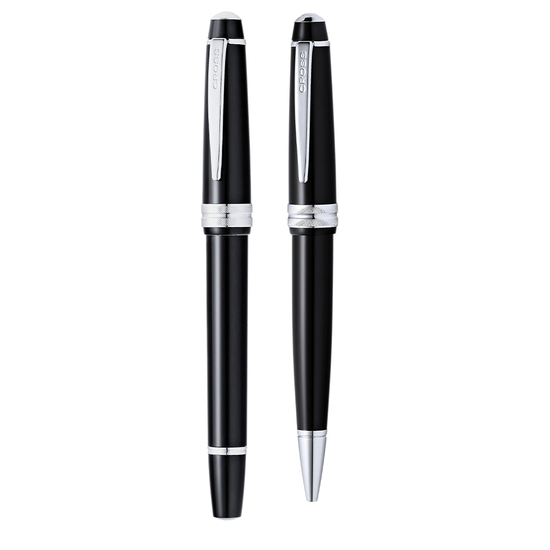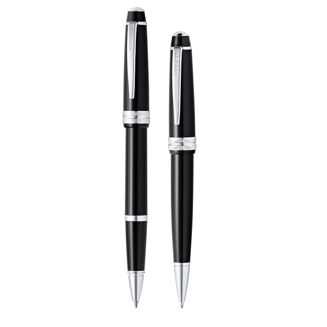 Set de bolígrafo y roller de Cross modelo Bailey Light, que combina una resina de alto brillo con acabados metálicos de cromo pulido. De cartucho jumbo y en tinta negra. Presentado en elegante estuche individual de color negro con logotipo de la marca, e interior en suave antelina.. Bolígrafo y Roller.. Tinta Negra