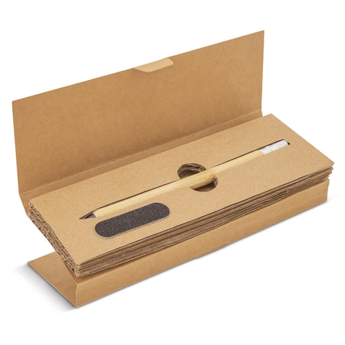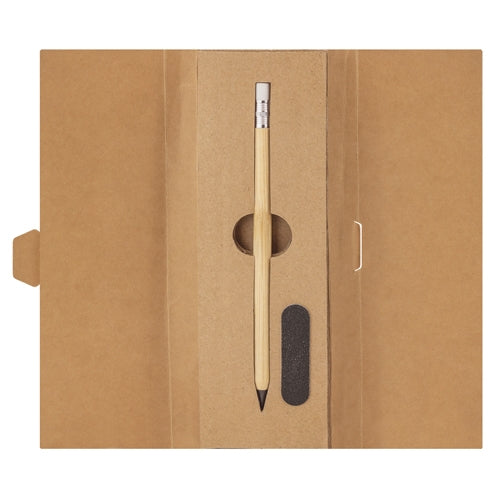 En un mundo cada vez más consciente sobre la importancia de la sostenibilidad, el Set de cartón reciclado es una elección impecable para aquellos que buscan reducir su impacto ambiental sin renunciar a la calidad y funcionalidad en sus herramientas de escritura y dibujo. Este conjunto elegante y práctico está compuesto por un innovador lápiz infinito, cuidadosamente fabricado en bambú, un material de rápido crecimiento conocido por su durabilidad y resistencia. Lo que lo distingue es su goma especial que, al borrar, no deja residuos, garantizando así una experiencia de uso limpia y placentera. Además, se incluye una lima eficiente diseñada específicamente para este lápiz, permitiendo afilar la punta fácilmente y mantenerla siempre en perfectas condiciones para escribir o dibujar. Este set, empacado en cartón reciclado, no solo es una opción ecológica, sino también un regalo pensativo y útil para estudiantes, profesionales o cualquiera que aprecie la papelería de alta calidad con una conciencia ambiental. Elige vivir verde y elegante con este set único. Set de cartón reciclado compuesto por un lápiz infinito, fabricado en bambú con goma que no deja residuos y lima, para afilar la punta y tenera siempre como nueva.