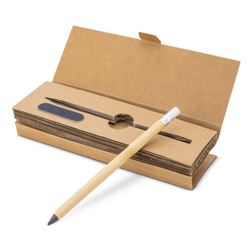- Lápiz infinito fabricado en bambú, un material duradero y resistente