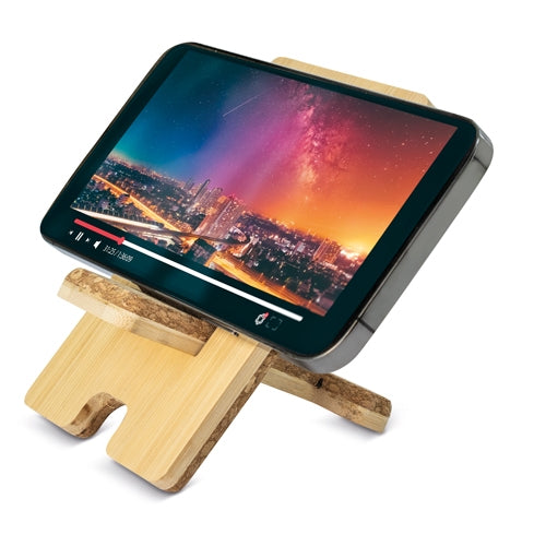 - Soporte para teléfono realizado en materiales naturales como bambú y corcho