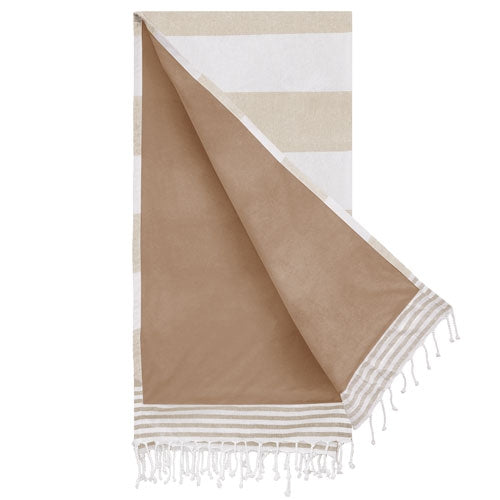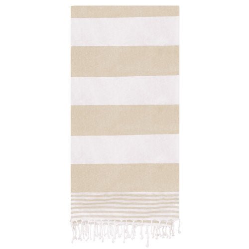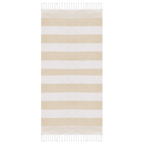 Disfruta del estilo y la funcionalidad con nuestra Toalla Pareo con Rizo "Cala Bonita", una elegante y práctica adición a tus días de playa o piscina. Confeccionada con una cara exterior 100% algodón, esta toalla pareo ofrece el equilibrio perfecto entre suavidad y absorción, ideal para envolverte tras un refrescante baño. El diseño en rayas, disponible en combinaciones de gris y de rojo-azul, aporta un toque de elegancia y modernidad a tu equipamiento de verano. El interior cuenta con una toalla de rizo 100% poliéster, perfectamente diseñada para secarte de manera eficiente mientras disfrutas del sol. Además, los cuidadosos detalles de flecos trenzados en los extremos no solo añaden un elemento decorativo sino que también resaltan la calidad y el cuidado puesto en su fabricación. Sea para tu uso personal o como un regalo sofisticado, la Toalla Pareo con Rizo "Cala Bonita" es una elección que combina estética con practicidad, haciendo de tus días al aire libre una experiencia aún más placentera.Descubra nuestra nueva colección de toallas pareo, con una gran variedad de colores que le permitirán adaptarse a su imagen corporativa. Imagine el logo de su empresa extendido en la arena de una playa paradisíaca, o en una piscina de lujo. La toalla pareo con rizo “Cala Bonita” (T-269) está realizada 100% en algodón en su exterior con un diseño a rayas disponible en gris y en rojo-azul. Su interior presenta una toalla de rizo, 100% poliéster. El acabado de flecos trenzados en los extremos le aporta un toque original y actual.